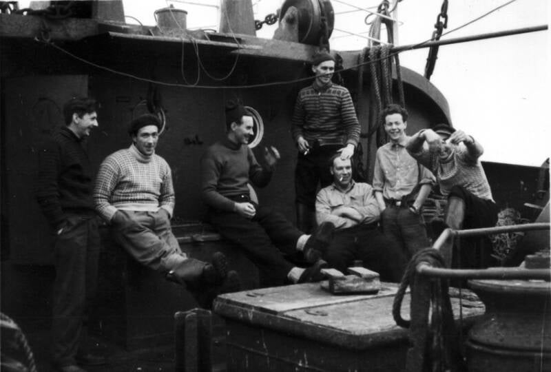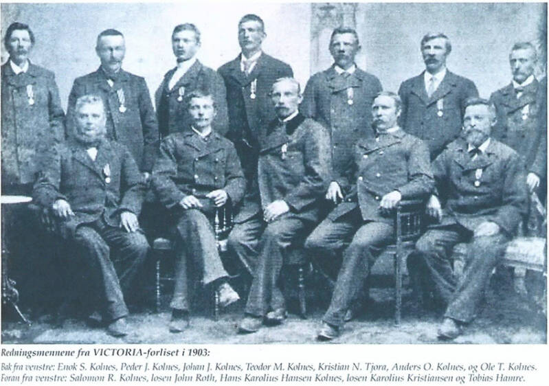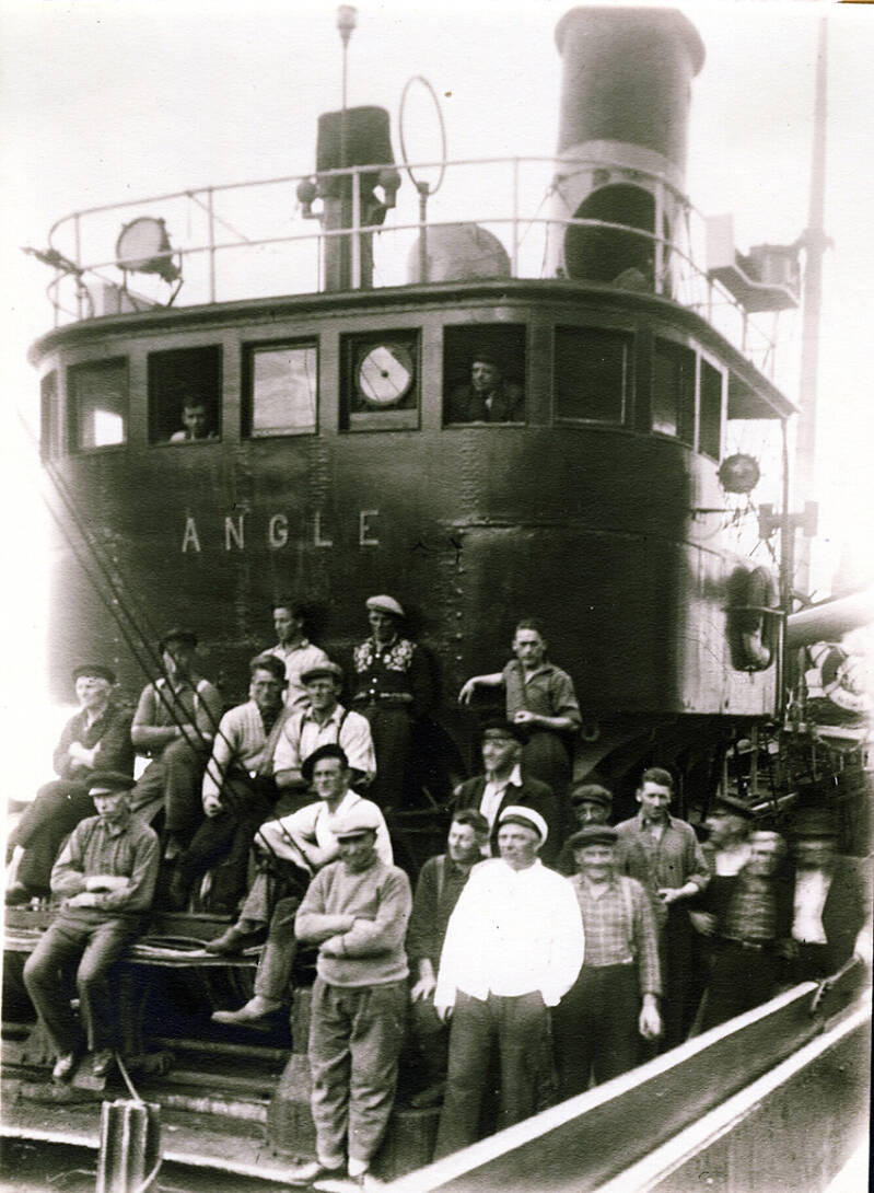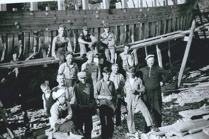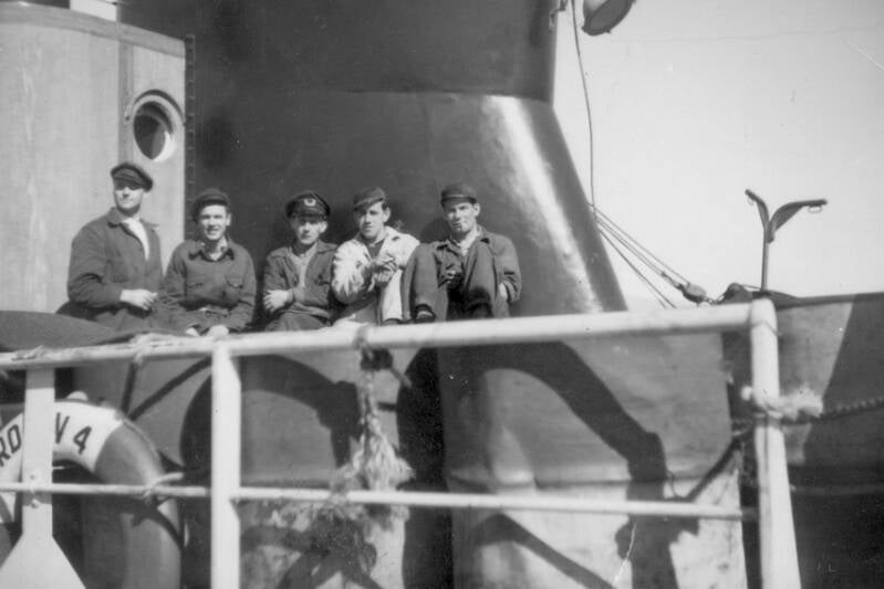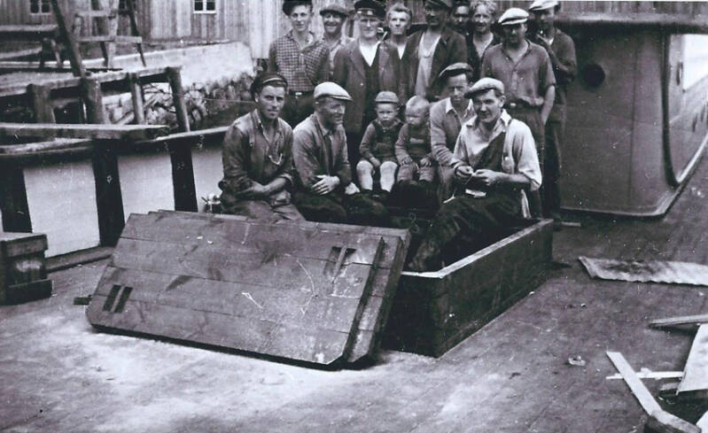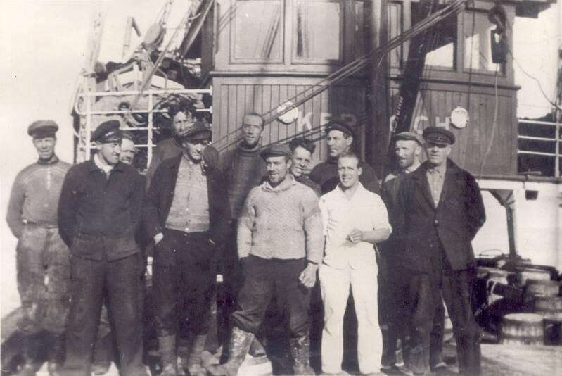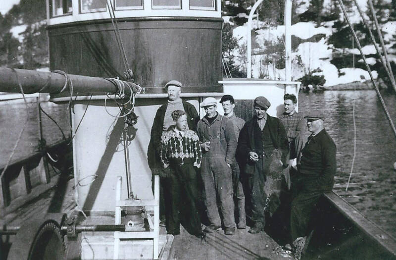 Guttorm Hagen, Ørsta: Nr 2 fra venstre er min farfar, Ragnvald Hagen Atle Vik 2015: Bekrefter Ragnvald Hagen. R. Hagen overtok som skipper da båten var ny og var sikkert med på overleveringa. Han var skipper helt fram til våren 1959, i hele damp-perioden. Da overtok far til Atle Vik. R. Hagen tok over nybygget m/s Sklinna våren 1959.