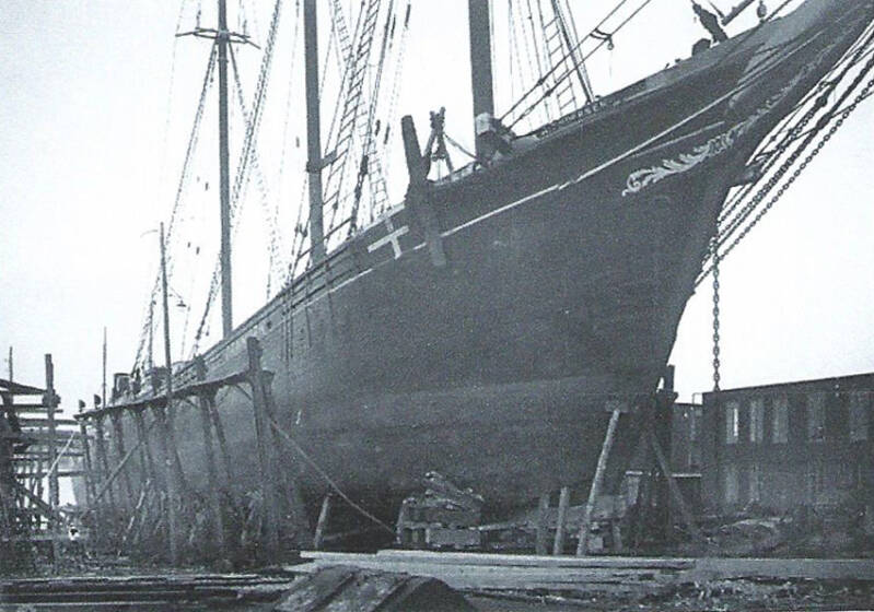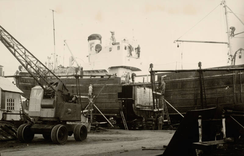 Kristiansund Mekaniske Verksted: "Caroline" gjenoppbygges ca 1950. som bilde viser. Kranaskjæret øverst til høyre og som nå i disse dager er startet med bygging som et eget prosjekt.