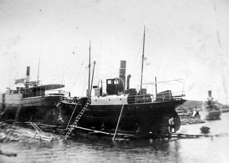 Bildet viser 2 båter på de nye patentslippvogna ved Storviks Mek. Verksted, den største slippen mellom Bergen og Trondheim, klinkbygget i stål 1918.