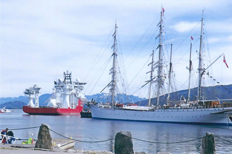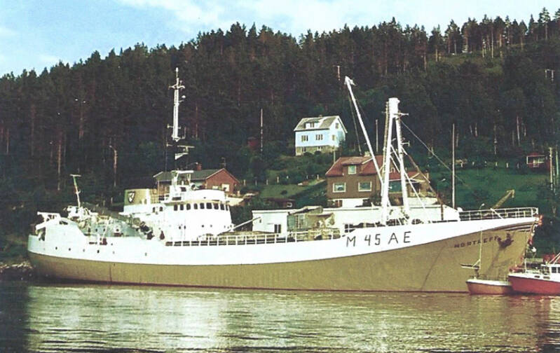 Den forreste er en baklader lastebåt M/S "Brettingen" fra Backers rederi og den bakerste en av byens sidetrålere M/T "Motind" M-99-K tilhørende rederiet Heinsa. Under baugen på "Motind" ses ekstra understøttelser pga. at aktre slippvogn er kort. Til høyre, ved piren, ses peleprammen "Aura", som ble brukt til peling under patentslippbanen ute i sjøen, og et bygg ved kaikanten.