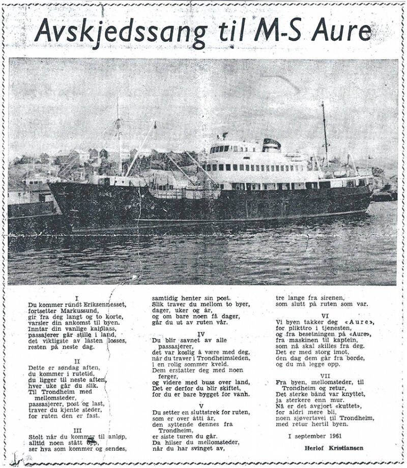 Aure gikk i rute mellom Trøndelag og Kristiansund i perioden 1950-1963, og har du en god historie, opplysninger om mannskap o.l. vil vi gjerne ha dine kommentarer. Trykk Les mer og bruk kommentarfeltet som dukker opp.