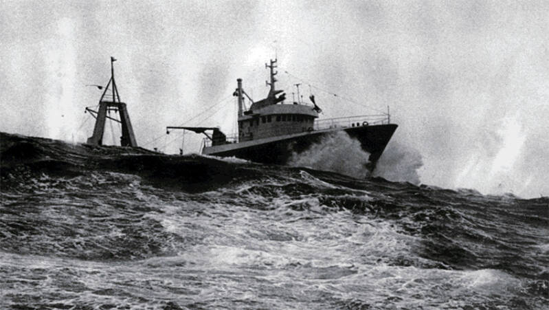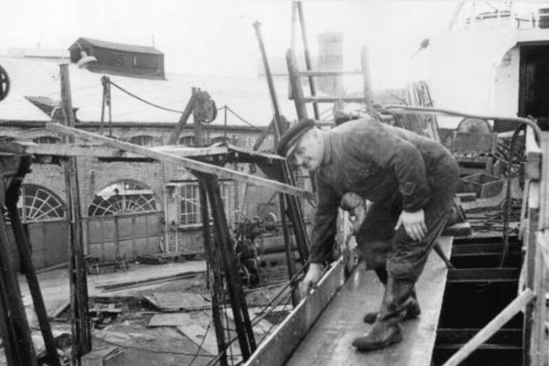 Foto trolig fra Sterkoder mekaniske verksted, hvor vi ser fra sjøsettingen av et skip. Ukjent fotograf. Bildet kan være fra 1983.