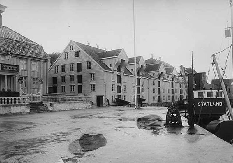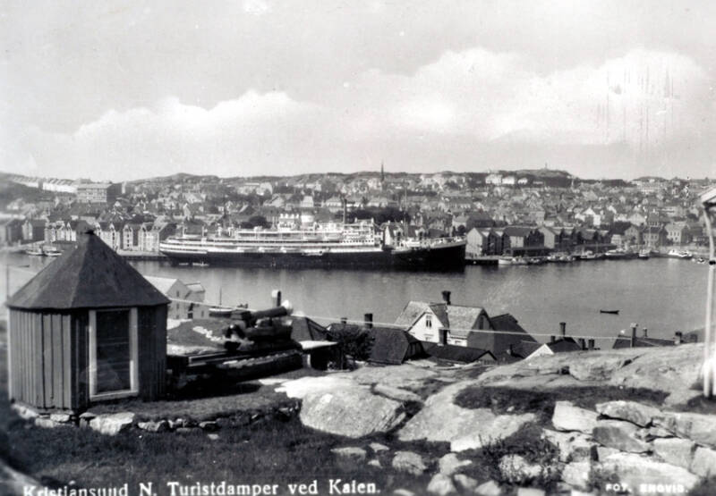 I front ved baugen på skipet er Geworbnerholmen (vises ikke på dette bildet) i Melkvikan (også kalt Krabbholmen) og anlegget. Der. I 1916 hadde Parelius & Lossius v/Rasmus Krogh igangsatt arbeid med å anlegge nytt verft med Edv. Aspen som skipsbyggmester. At holmen på folkemunne ble kalt for «Krabbholmen» hadde sin naturlige årsak. På 1930-tallet ble «Standard», en fabrikk for nedlegging av krabbe etablert her. (Usikker på om det var «Werring Canning Co. A/S» som drev den fra 1930). I bakgrunnen Kvernberget og bebyggelsen på Dale som den gang tilhørte Bremsnes.
