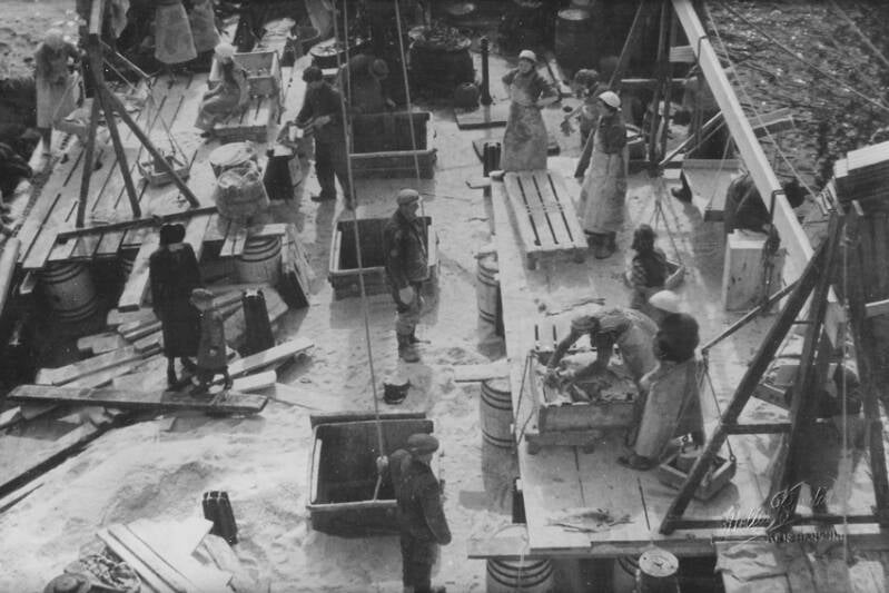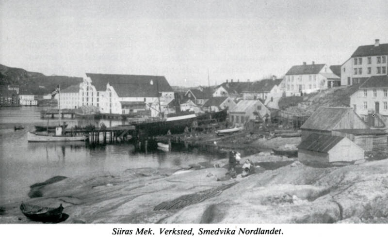 På dette tidspunkt var verkstedet blitt et av de mest praktiske, velordnede og tidsmessige verksteder i sitt slag i landet. I bakgrunnen ses Skorpa med Visnesbrygga og Meløya.